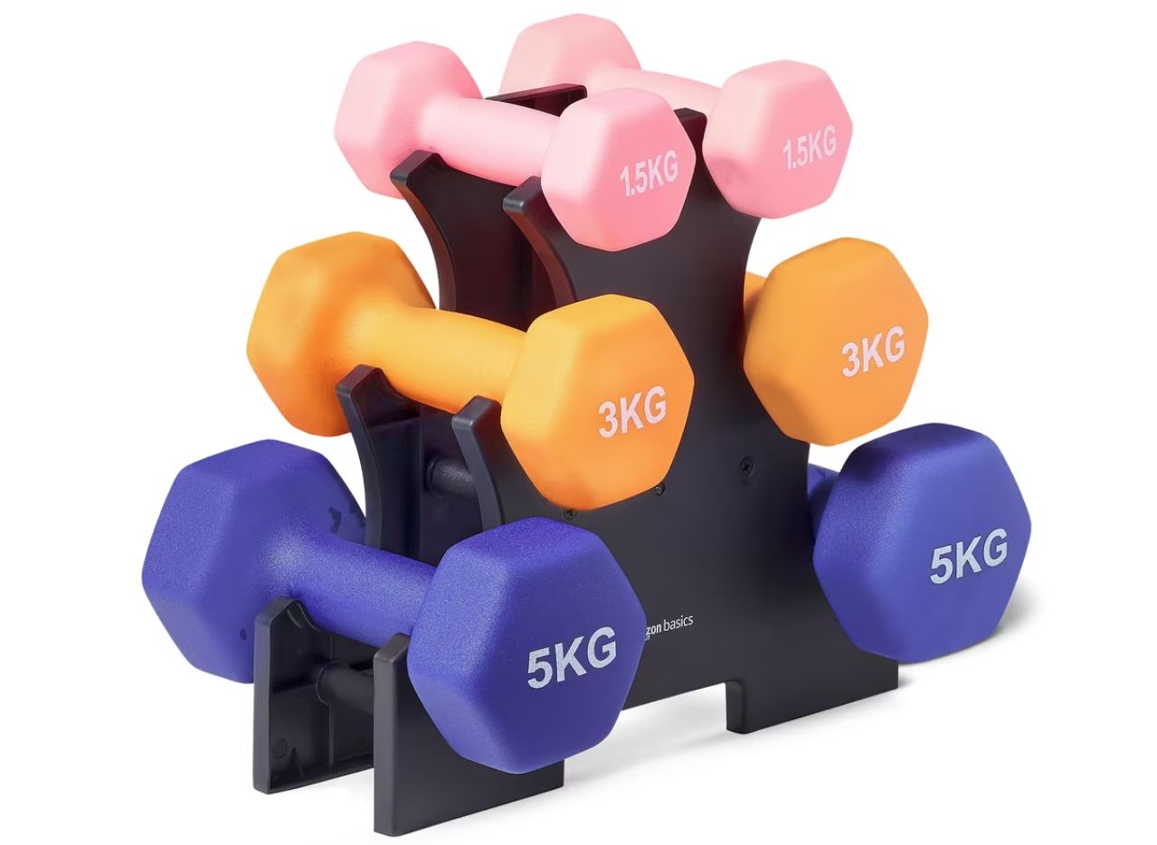โจ Kit completo de entrenamiento para casa que incluye 3 pares de mancuernas (1,5 kg, 3 kg y 5 kg) y un prรกctico soporte para mantenerlas organizadas. Su diseรฑo hexagonal evita que rueden por el suelo