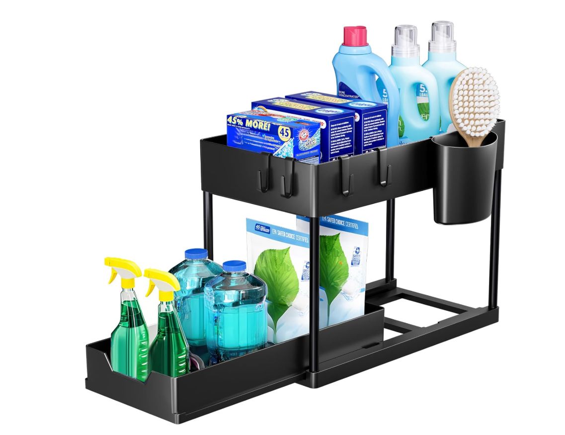 ✨ Organizador con cajón inferior deslizable y tubos de acero inoxidable que maximiza el espacio en la cocina o el baño e incluye ganchos desmontables y una cesta colgante