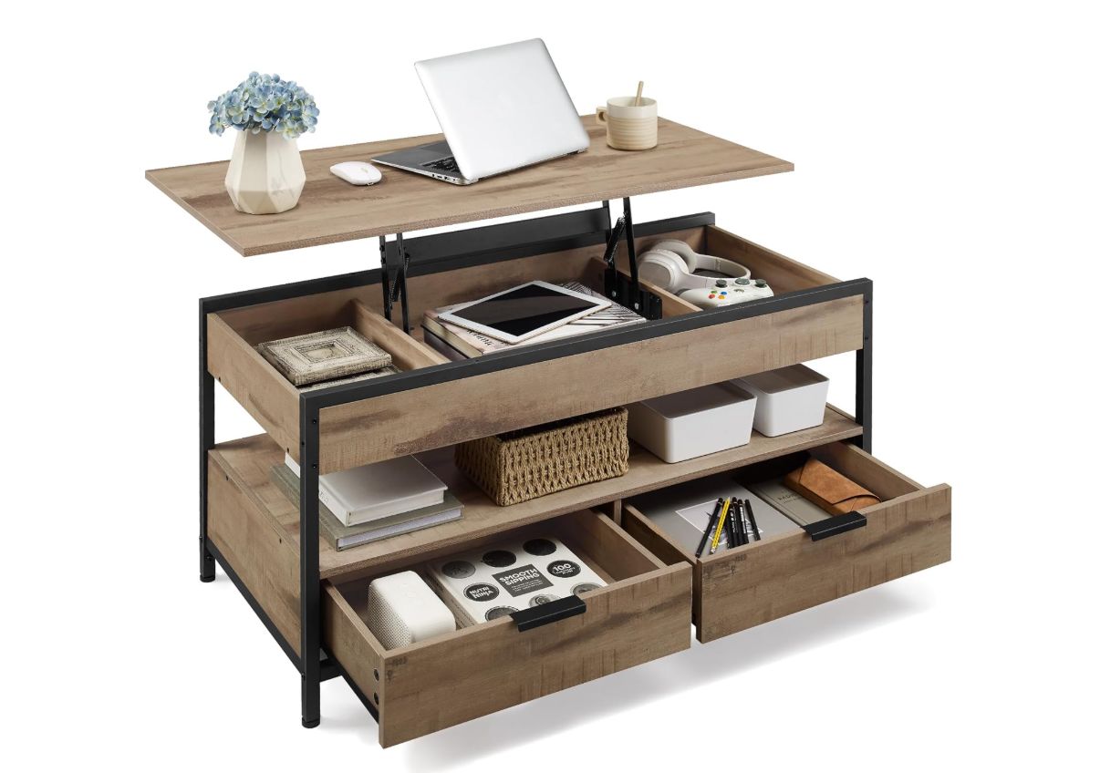 ✨ Mesa de salón con tablero regulable de 48 a 63 cm, 3 compartimentos ocultos, 2 cajones y estante abierto. Soporta hasta 136 kg. Estilo industrial en marrón y negro