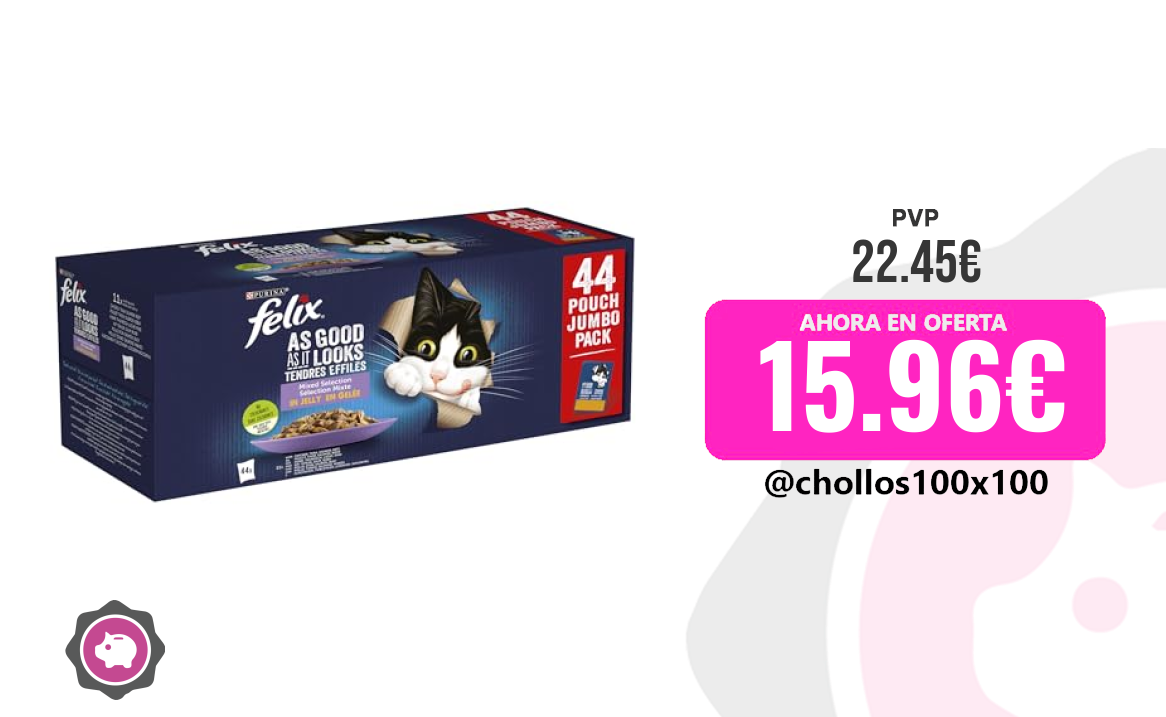 ✨¡Mima a tu felino con FELIX Fantastic! Deliciosos trozos en jugosa gelatina con irresistibles sabores como buey, pollo, salmón y atún. Un festín completo y equilibrado con vitaminas esenciales y Omega 6 para una salud radiante. Ingredientes de calidad sin aditivos artificiales, ¡solo placer para tu gato!