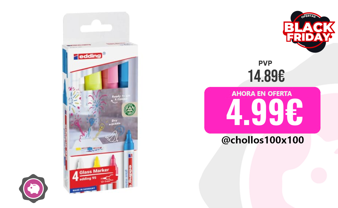 ✨Dale rienda suelta a tu creatividad con edding 95, el marcador para cristal que transforma ventanas y pizarras en lienzos vibrantes. Escribe, dibuja y personaliza con colores intensos y borrado fácil, ¡perfecto para el hogar y la oficina! Consigue tu set de 4 colores y descubre un mundo de posibilidades. Disponible en 6 tonos que iluminarán tu día a día.