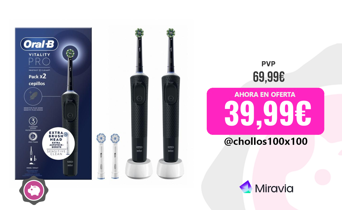 ✨¡Aprovecha esta oferta increíble! 🏷️ Consigue el Pack x2 de Cepillos eléctricos Oral-B Vitality Pro en color Negro por solo 39,99€. Incluye 2 cargadores y 4 recambios. ¡Sonrisas brillantes a un precio inmejorable! 😁✨