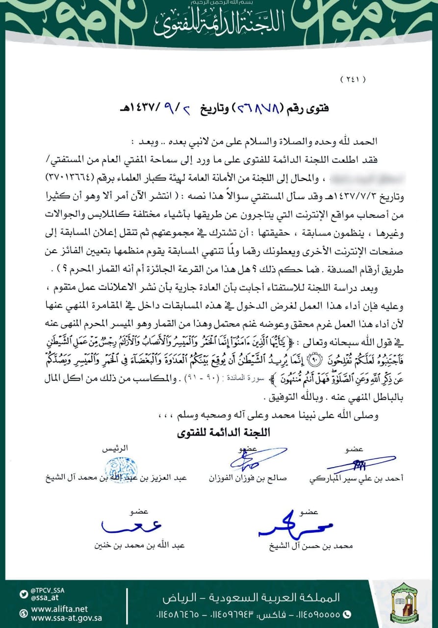 فقد اطلعت اللجنة الدائمة للفتوى على ما ورد إلى سماحة المفتي العام من المستفتي/ والمحال إلى اللجنة من الأمانة العامة لهيئة كبار العلماء برقم (٣٧٠١٣٦٦٤) ، وتاريخ ١٤٣٧/٧/٣هـ وقد سأل المستفتي سؤالاً هذا نصه : (انتشر الآن أمر ألا وهو أن كثيرا من أصحاب مواقع الإنترنت التي يتاجرون عن طريقها بأشياء مختلفة كالملابس والجوالات وغيرها ، ينظمون مسابقة ، حقيقتها : أن تشترك في مجموعتهم ثم تنقل إعلان المسابقة إلى صفحات الإنترنت الأخرى ويعطونك رقما ولما تنتهي المسابقة يقوم منظمها بتعيين الفائز عن طريق أرقام الصدفة ، فما حكم ذلك؟ هل هذا من القرعة الجائزة أم أنه القمار المحرم؟) ، وبعد دراسة اللجنة للاستفتاء أجابت بأن العادة جارية بأن نشر الاعلانات عمل متقوم ، وعليه فإن أداء هذا العمل لغرض الدخول في هذه المسابقات داخل في المقامرة المنهي عنها لأن أداء هذا العمل غرم محقق وعوضه غنم محتمل وهذا من القمار وهو الميسر المحرم المنهي عنه في قول الله سبحانه وتعالى : ﴿يَأَيُّهَا الَّذِينَ ءَامَنُوا إِنَّمَا الْخَمْرُ وَالْمَيْسِرُ وَالْأَنصَابُ وَالْأَزْلَامُ رِجْسٌ مِنْ عَمَلِ الشَّيْطَانِ فَاجْتَنِبُوهُ لَعَلَّكُمْ تُفْلِحُونَ إِنَّمَا يُرِيدُ الشَّيْطَانُ أَن يُوقِعَ بَيْنَكُمُ الْعَدَاوَةَ وَالْبَغْضَاءَ فِي الْخَيْرِ وَالْمَيْسِرِ وَيَصُدَّكُمْ عَن ذِكْرِ اللهِ وَعَنِ الصَّلَاة فَهَلْ أَنتُم مُنتَهُونَ﴾ [سورة المائدة : ۹٠ - ۹۱] ، والمكاسب من ذلك من أكل المال بالباطل المنهي عنه ، وبالله التوفيق ، وصلى الله على نبينا محمد وعلى آله وصحبه وسلم . إهـ