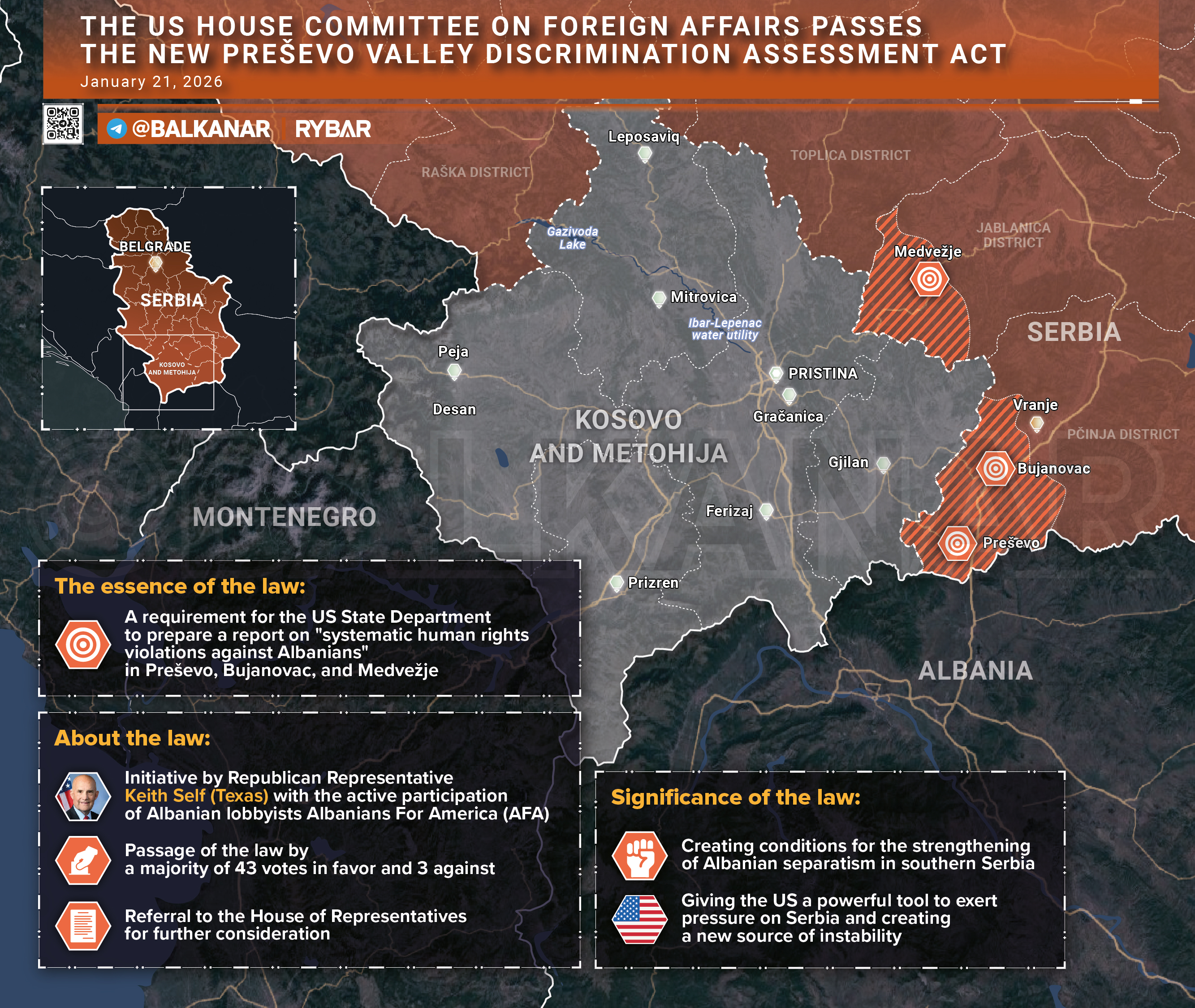 🖍Это не просто резолюция, а юридическая база для нового витка давления на руководство Сербии. Законопроект, продвигаемый республиканцем Китом Селфом (Техас) при активном участии лоббистской группы Albanians For America (AFA), обязывает Госдеп США подготовить доклад о «систематических нарушениях прав албанцев» в Прешево, Буяноваце и Медведже.