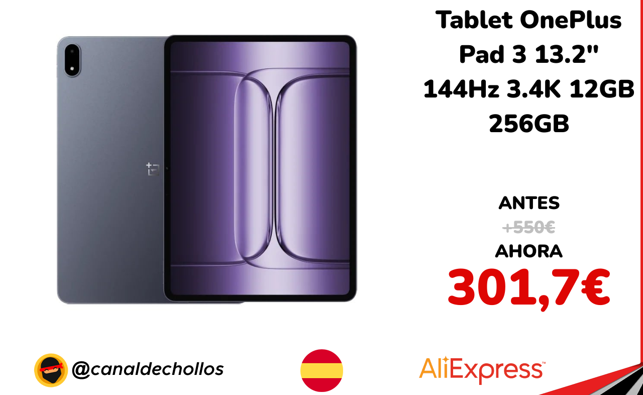 🔹 Tablet OnePlus Pad 3 13.2" 144Hz 3.4K 12GB 256GB solo 301,7€ ❗️💥 (PVP: +550€)