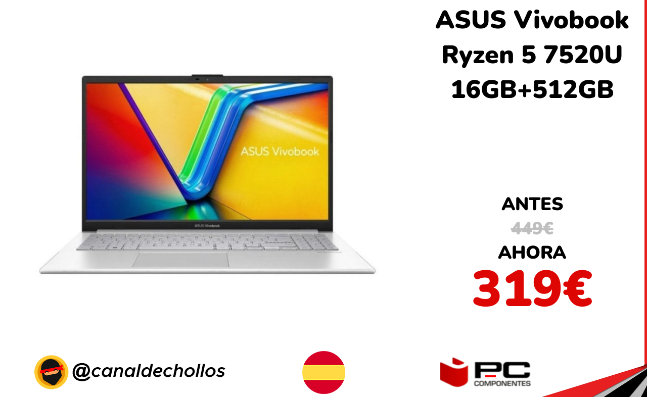 🔹 ASUS Vivobook Ryzen 5 7520U 16GB+512GB solo 319€ ❗️💥 (PVP: 449€)
