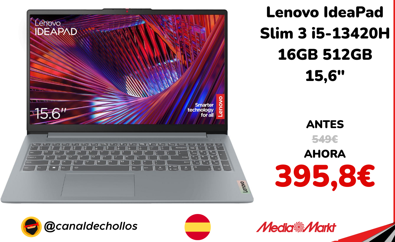 🔹 Lenovo IdeaPad Slim 3 i5-13420H 16GB 512GB 15,6" solo 395,8€ ❗️💥 (PVP: 549€)