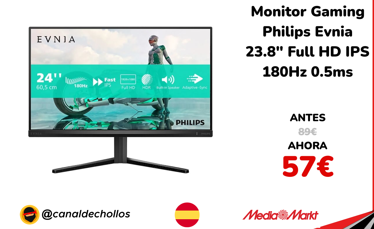 🔹 Monitor Gaming Philips Evnia 23.8" Full HD IPS 180Hz 0.5ms solo 57€ ❗️💥 (PVP: 89€)
