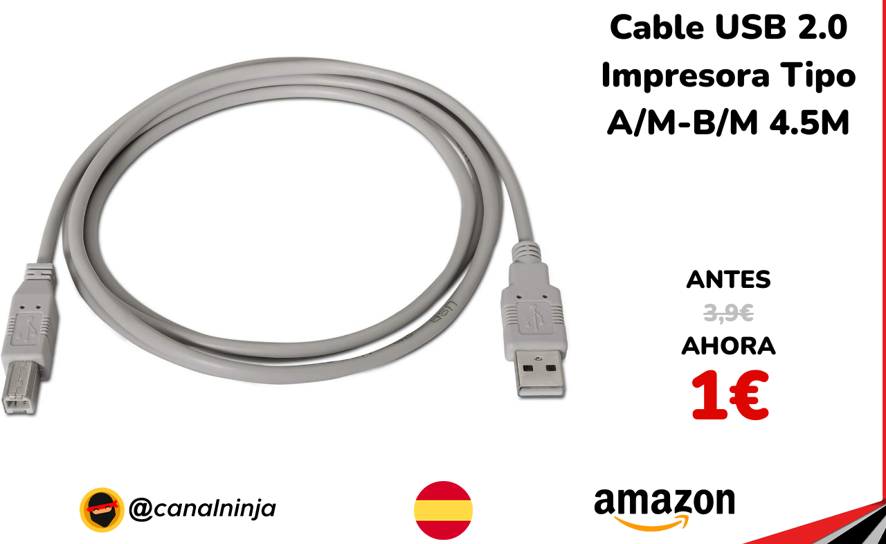 🔹 Cable USB 2.0 Impresora Tipo A/M-B/M 4.5M solo 1€ ❗️⚔️️ (PVP: 3,9€)