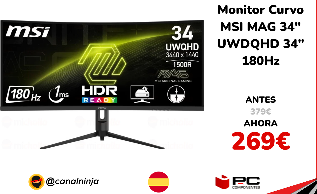 🔹 Monitor Curvo MSI MAG 34" UWDQHD 34" 180Hz solo 269€ ❗️⚔️️ (PVP: 379€)