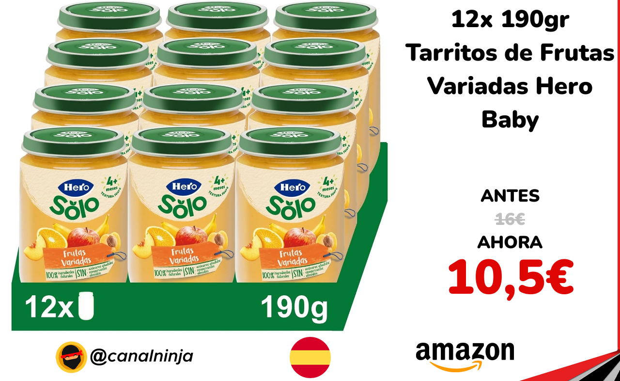 ✨ Muy buen precio para este pack de 12 botes de frutas variadas de Hero baby, elaboradas con ingredientes naturales, y aptas para los peques a partir de los 4 meses, con ingredientes como plátano, manzana, melocotón, naranja, albaricoque y vitamina C. Vendido y enviado por Amazon.