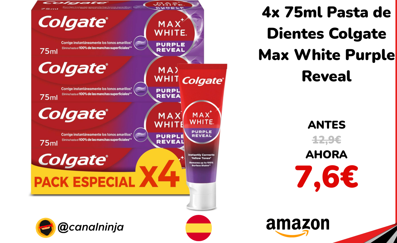 🔹 4x 75ml Pasta de Dientes Colgate Max White Purple Reveal solo 7,6€ ❗️⚔️️ (PVP: 12,9€)