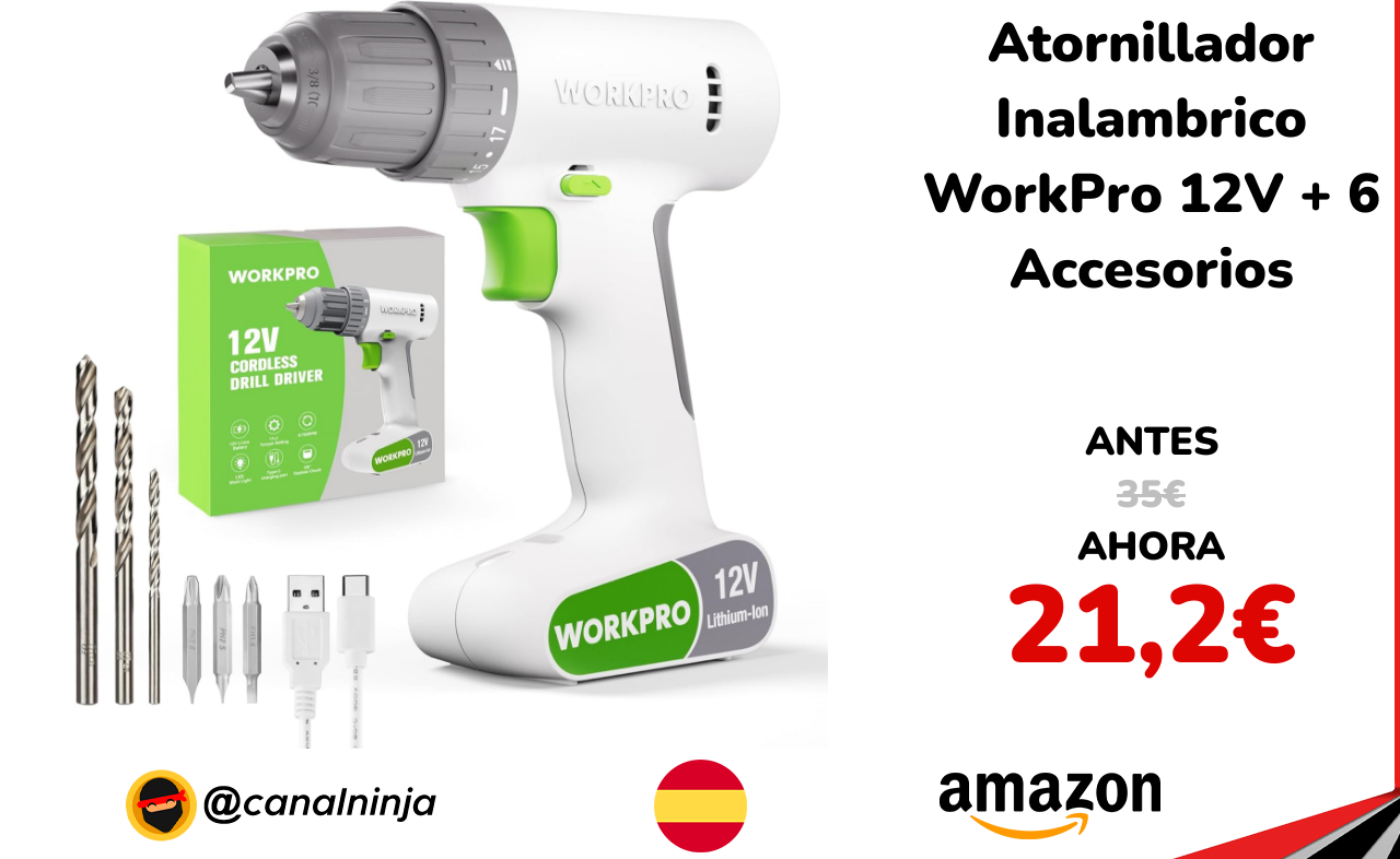 🔹 Atornillador Inalambrico WorkPro 12V + 6 Accesorios solo 21,2€ ❗️⚔️️ (PVP: 35€)