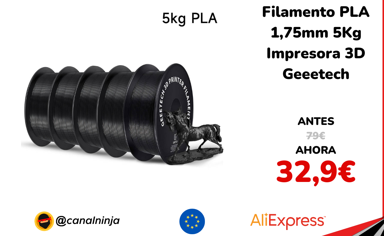 ✨ Cupón dto. para este pack de 5Kg de filamento PLA 1,75mm, de 1Kg cada bobina de la marca Geeetech, ideal para impresoras 3D FDM. Permite impresiones de calidad, sin burbujas, a una temperatura de entre 205-230ºC. Te sale cada bobina de 1Kg a 6,7€. Envío GRATIS.