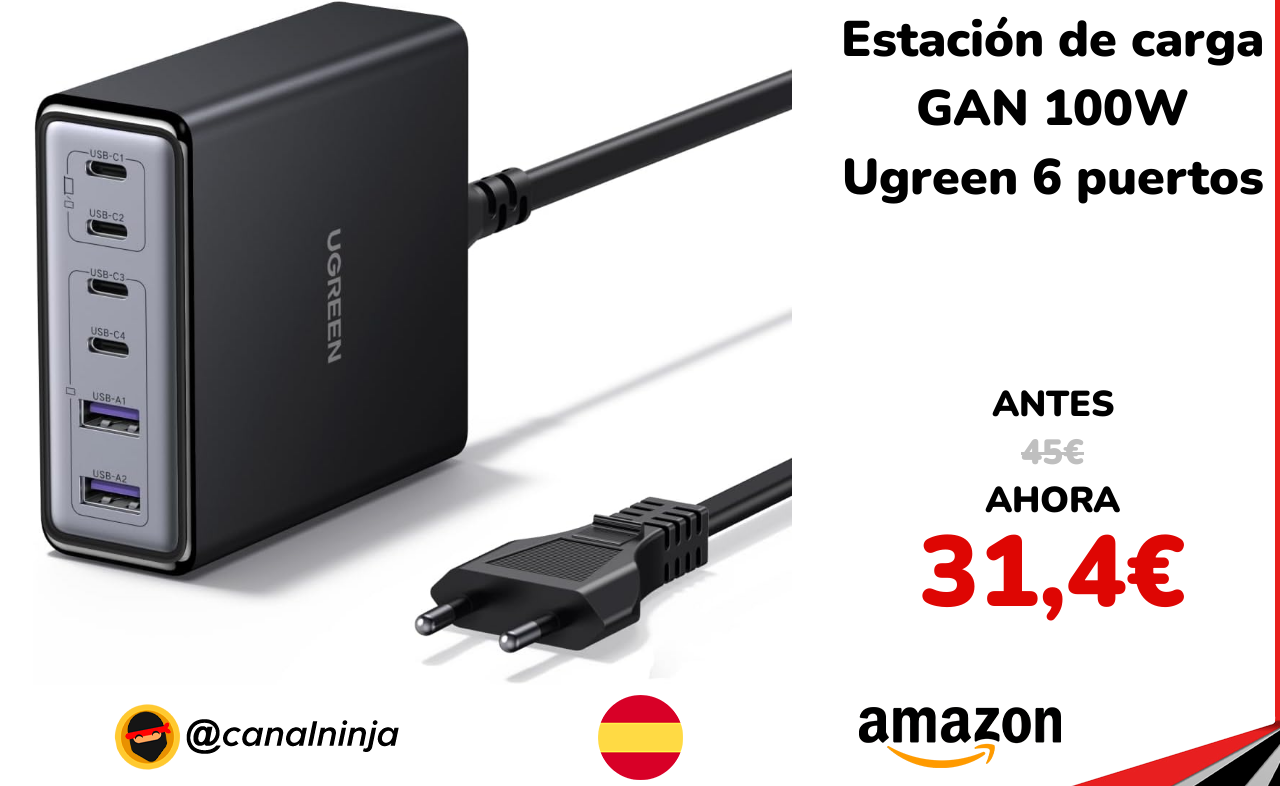 ✨ Gran precio para esta útil estación de carga UGreen con 100W de potencia, carga balanceada automáticamente y conexiones de 4 puertos USB-C y 2 USB-A. Compatible con portátiles, tablets, smartphones y weareables. Incluye base organizadora para escritorio. Enviado por Amazon.