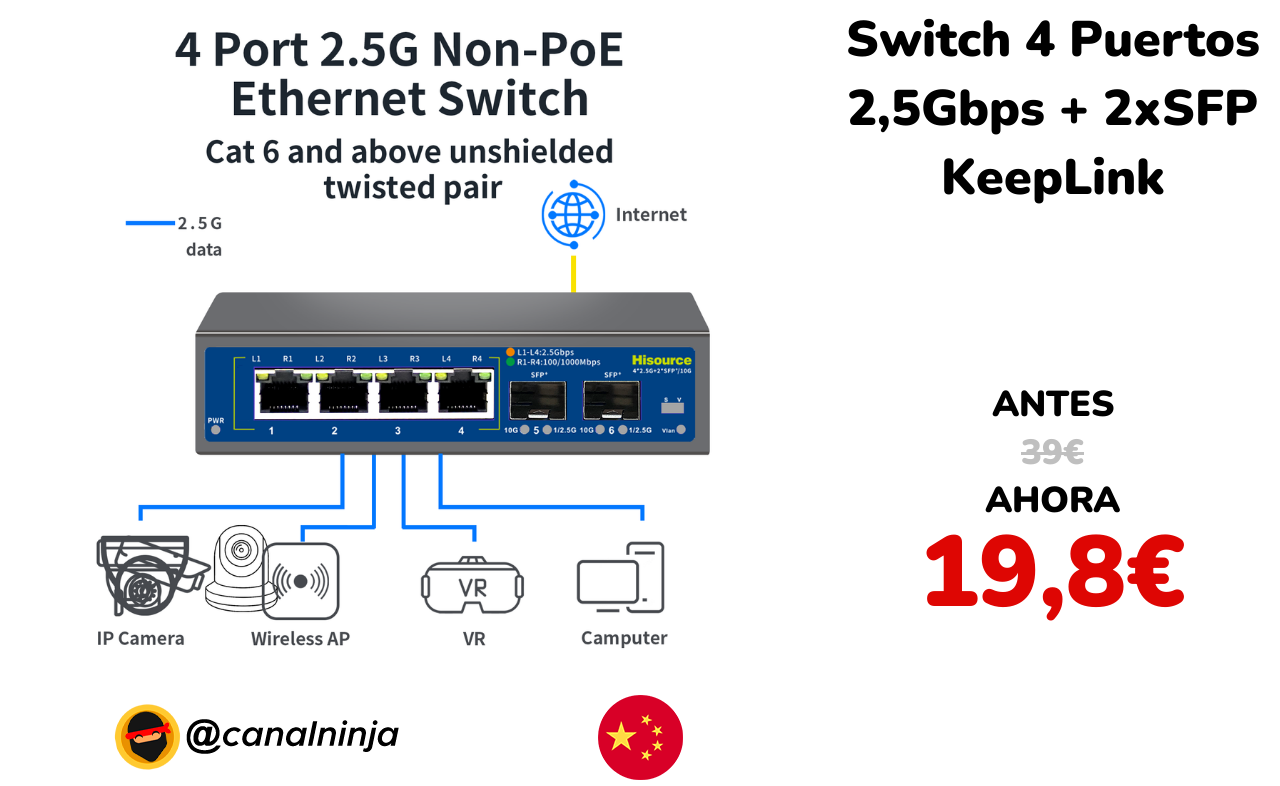 🔹 Switch 4 Puertos 2,5Gbps + 2xSFP KeepLink solo 19,8€ ❗️⚔️️ (PVP: 39€)
