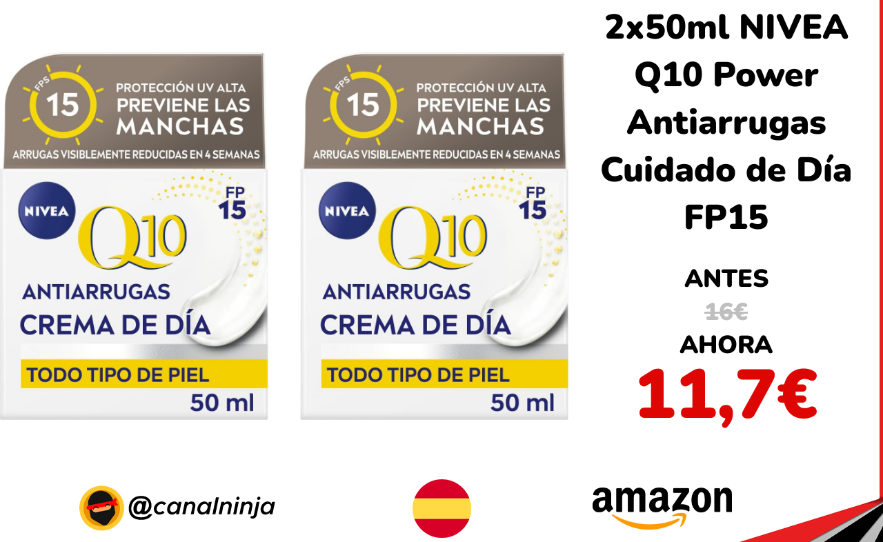 ✨ Buen precio para esta pack de 2x 50ml NIVEA Q10 Power. Crema de día de 50 ml con coenzima Q10 y creatina que ayudan a reducir arrugas visibles y mejorar firmeza. Incluye FP15 para protección diaria frente a la radiación solar moderada. Textura ligera, apta para piel normal y seca, pensada para uso continuado en la rutina facial. Vendido y enviado por Amazon.