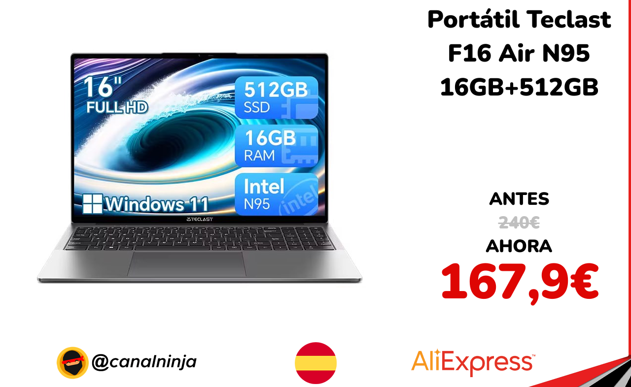 🔹 Portátil Teclast F16 Air N95 16GB+512GB solo 167,9€ ❗️⚔️️ (PVP: 240€)