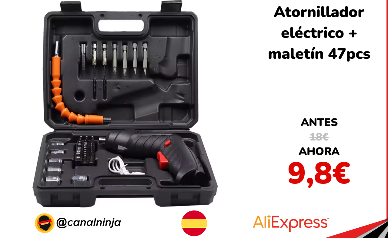 🔹 Atornillador eléctrico + maletín 47pcs solo 9,8€ ❗️⚔️️ (PVP: 18€)