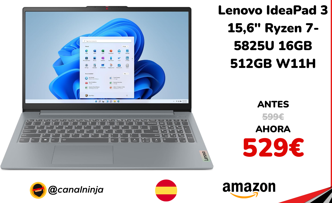 🔹 Lenovo IdeaPad 3 15,6" Ryzen 7-5825U 16GB 512GB W11H solo 529€ ❗️⚔️️ (PVP: 599€)