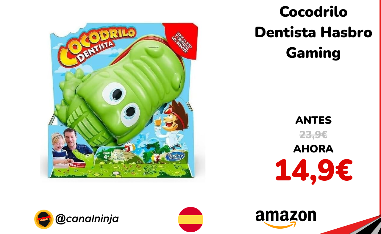 ✨ Buen precio para este juego interactivo de Hasbro Gaming llamado Cocodrilo Dentista para niños desde 4 años. Incluye un cocodrilo con dientes presionables: uno activa su mordida al azar. Ideal para desarrollar reflejos y coordinación y para divertirse un rato en familia. En El Corte Inglés cuesta 23,9€. Vendido y enviado por Amazon.