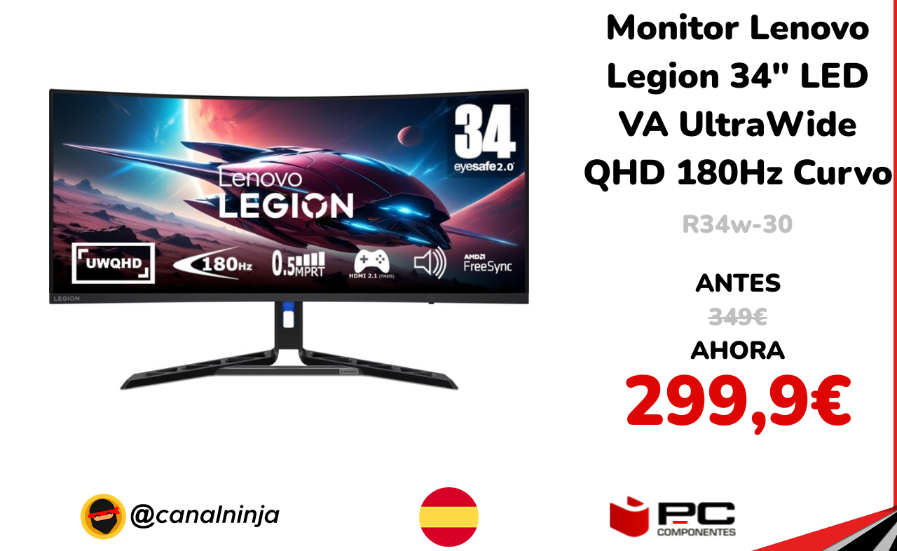 🔹 Monitor Lenovo Legion 34" LED VA UltraWide QHD 180Hz Curvo solo 299,9€ ❗️⚔️️ (PVP: 349€)