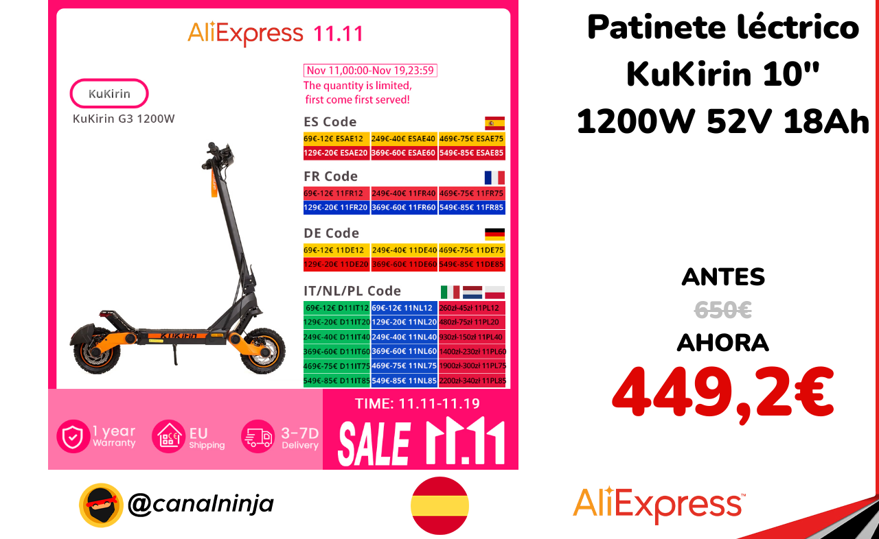 🔹 Patinete léctrico KuKirin 10" 1200W 52V 18Ah solo 449,2€ ❗️⚔️️ (PVP: 650€)