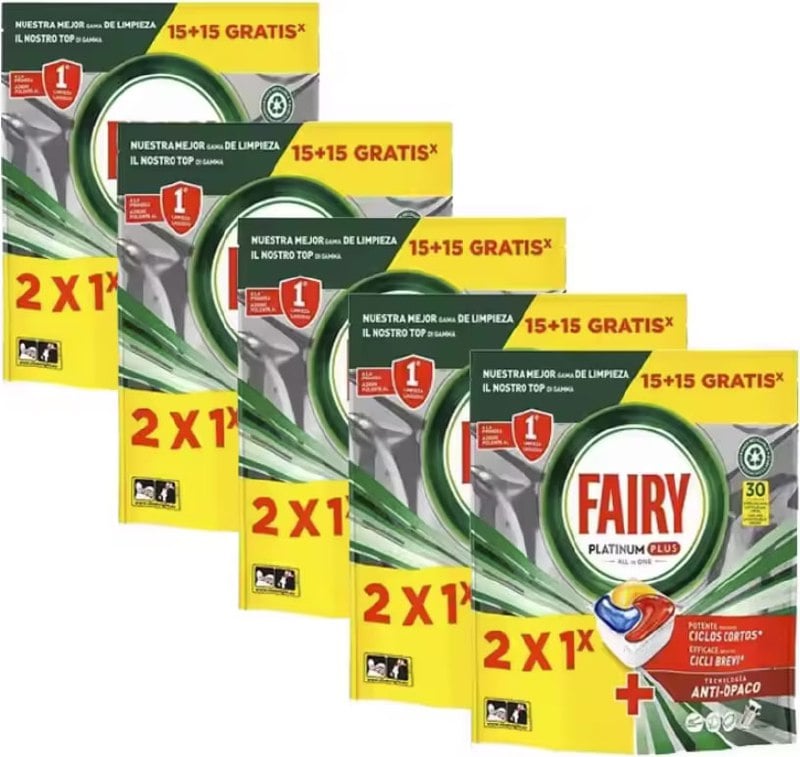 ✨ Cupón para este set de 5 paquetes de cápsulas de Fairy Platinum con un total de 150 cápsulas. Con las all in one que combina líquido y detergente en polvo en una poderosa cápsula te restaura el brillo original de tus platos gracias a su tecnología contra la pérdida de brillo incorporada. Son eficaz incluso en ciclos cortos. Envío gratis.
