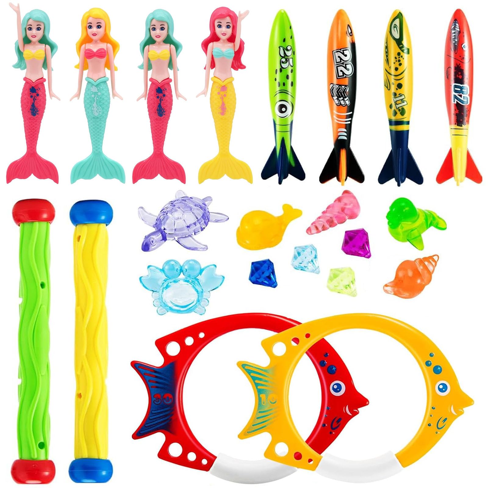 ✴️Cakuni Juguetes de Buceo, Juguete de Natación para Piscina 22 PCS con Juguetes de Sirena, Palos de Buceo, Anillos de Pescado, Torpedos, Gemas de Buceo para Niños #Publicidad