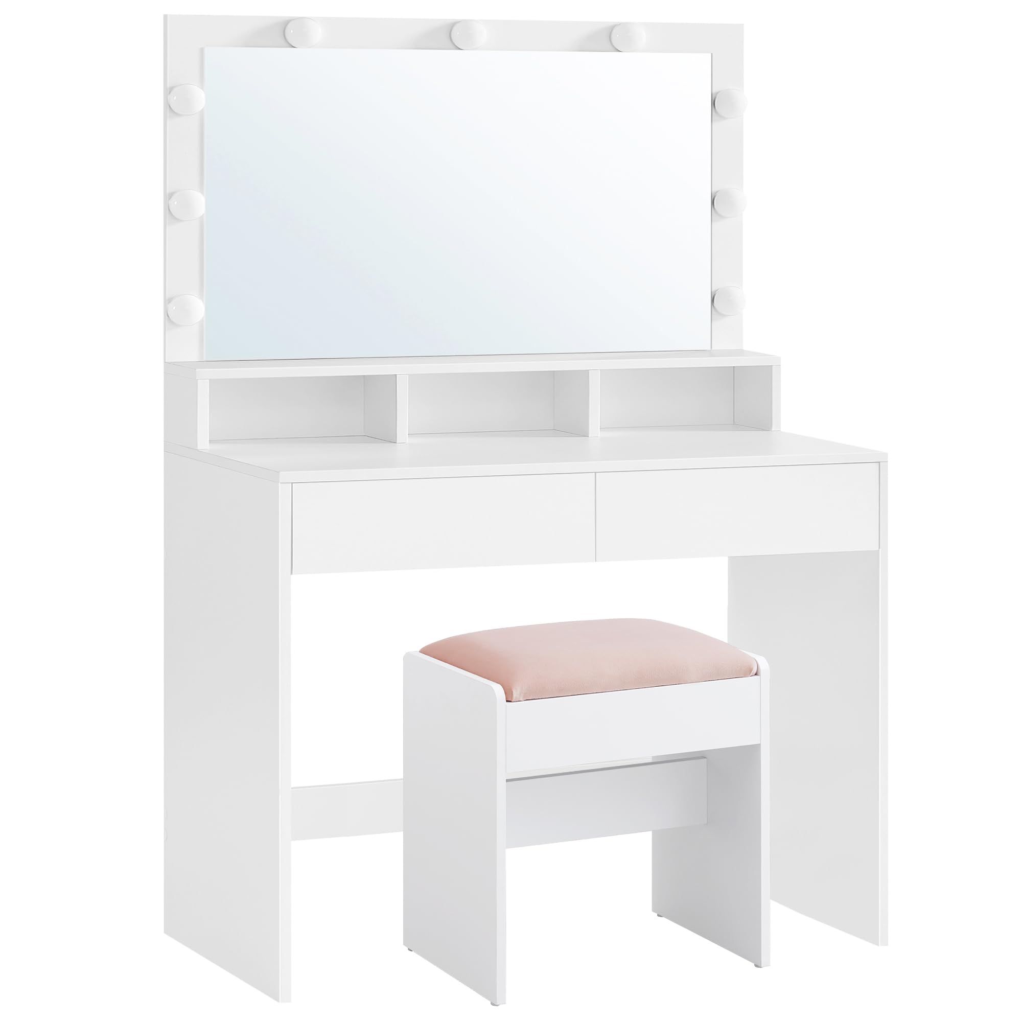 ✴️VASAGLE Kailyn Colección - Tocador con Taburete, Mesa de Maquillaje con Espejo y Luces LED con Brillo Ajustable, 2 Cajones y 3 Compartimentos, Moderno, Blanco Nube RDT720W01 #Publicidad