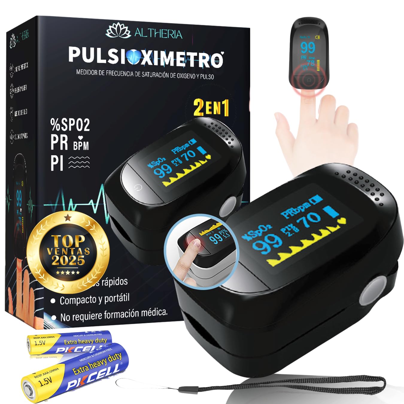✴️ALTHERIA® Pulsioximetro de Dedo Profesional con PILAS INCLUIDAS - Oximetro y Pulsometro HOMOLOGADO Medidor de Oxigeno en Sangre Dedo - Saturador Oxigeno Dedo con Pantalla LED y Apagado Automático. #Publicidad