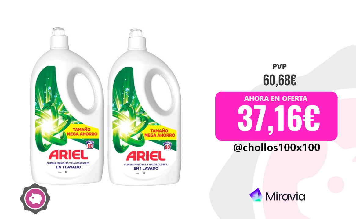 ✨ ¡Descubre Ariel, tu aliado perfecto para la colada! 🌟 Con su fórmula mejorada, garantiza 160 lavados limpios y frescos, incluso en ciclos fríos. 🧺✨ ¡Haz que tu ropa luzca como nueva! 💧🛍 Solo por 37,16€.