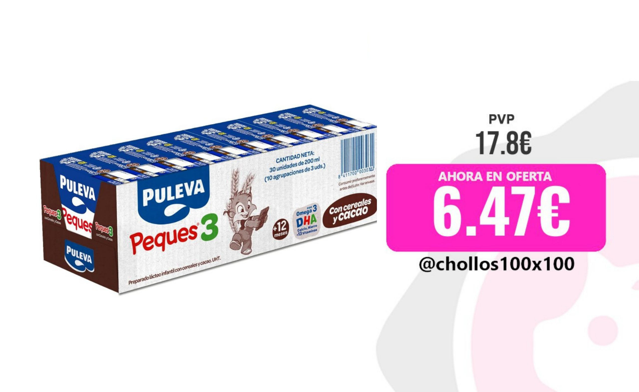 ✨ ¡Dale a tu peque el impulso que necesita! Puleva Peques 3 Cereales y Cacao nutre su cerebro con Omega 3 DHA y hierro, fortalece sus huesos con calcio y potencia sus defensas con 13 vitaminas. ¡Con un sabor delicioso que le encantará y la confianza de 40 años de experiencia! Un vaso al día marca la diferencia.