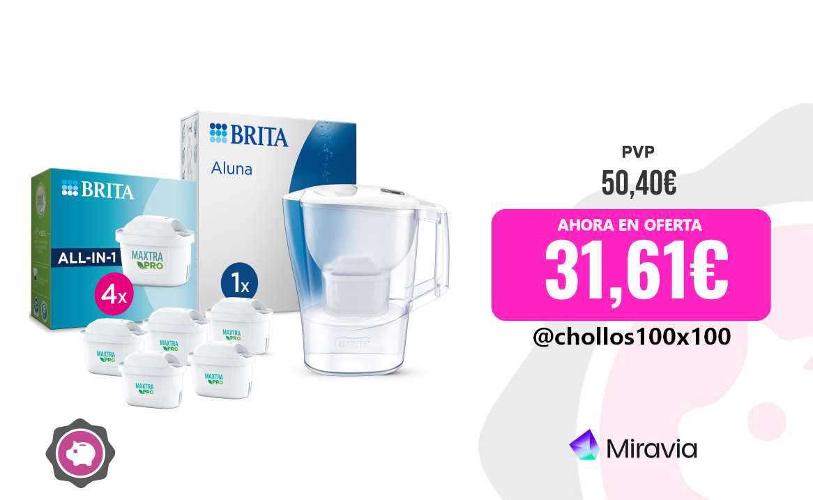 ✨¡Dile adiós al agua del grifo con sabor raro! 💧 Con la jarra BRITA (y 5 filtros MAXTRA PRO de regalo), disfruta de hasta 150 litros de agua pura y deliciosa, libre de cal y cloro. Olvídate de comprar botellas de plástico y ahorra dinero con su diseño sostenible y apto para lavavajillas. ¡Consíguela ahora por solo 31,61€ y empieza a beber mejor hoy mismo!
