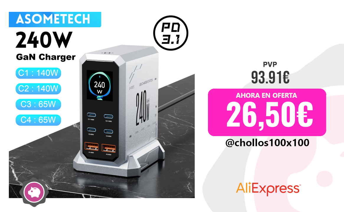 ✨¡Cansado de tener un cargador para cada dispositivo? 😩 Con nuestro nuevo cargador GaN de 240W, ¡carga tu MacBook, iPhone, tablet y más, todo a la vez! ⚡️ Su tecnología de carga rápida PD te da energía en tiempo récord. ¡Simplifica tu vida digital y olvídate del caos de cables! 😉 ¡Consíguelo ahora y recarga tu mundo! 🚀