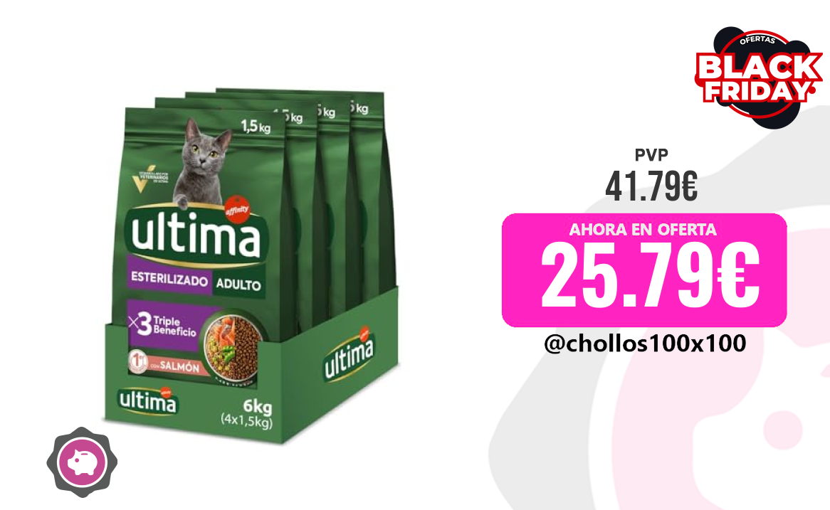 ✅ Ultima Esterilizado Adult Salmon, Comida seca para gatos, Pack de 4 x 1,5kg, Total 6kg