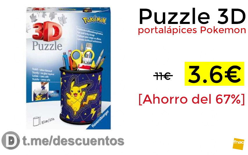 ✨Buen precio para este puzzle 3D de Ravensburger , se trata de un bote portalápices de Pokemon. Vienen un total de 54 piezas y está recomendado a partir de 6 años.