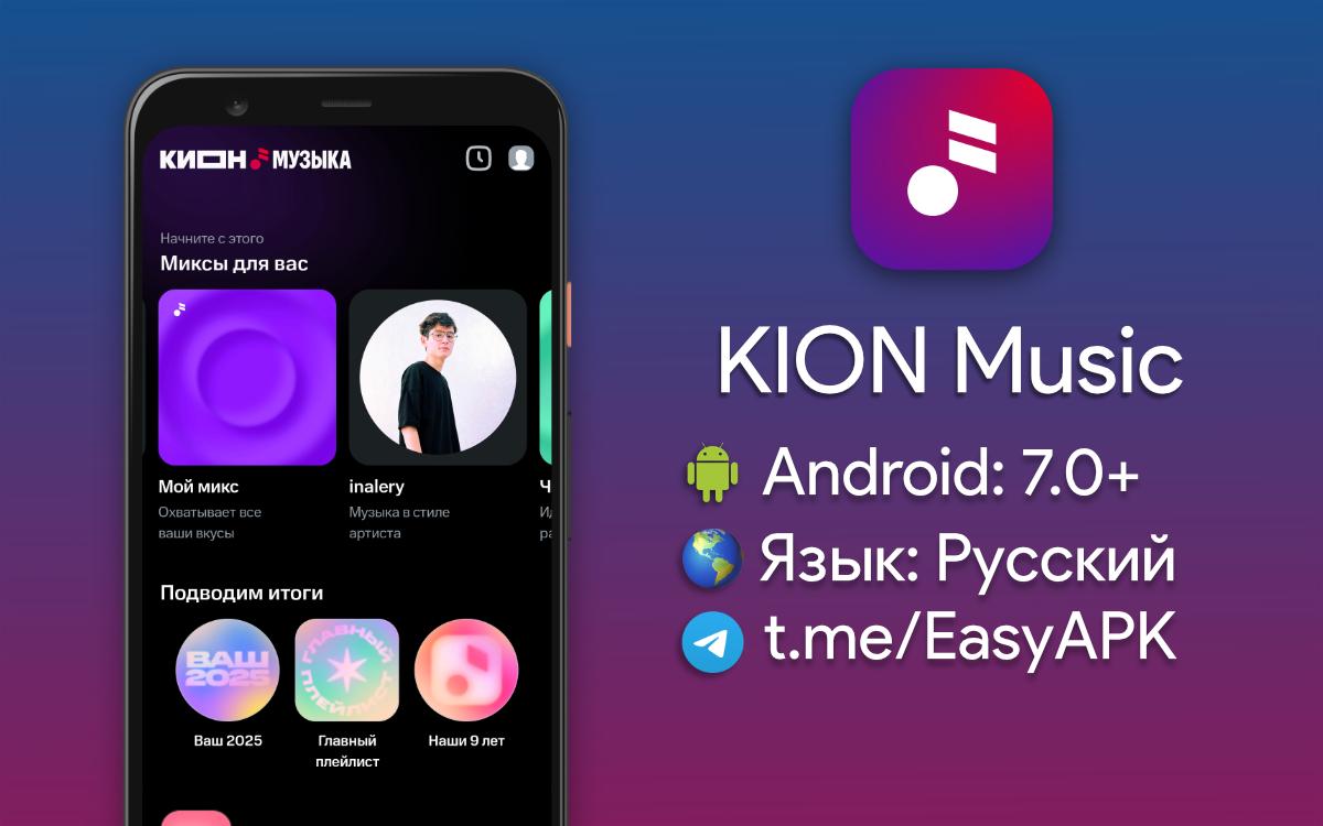 КИОН Музыка — музыкальный сервис от сотового оператора со взломанной подпиской. Используется библиотека Яндекс.Музыки. #apps @EasyAPK