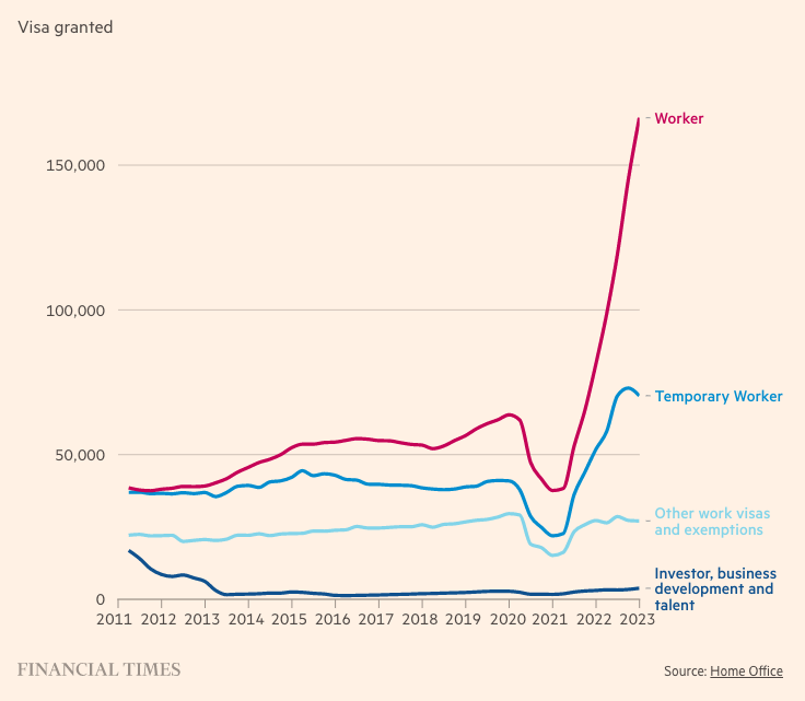 Этот всплеск отчасти объясняется потоками из Украины и Гонконга, восстановлением трансграничных перемещений после пандемии, а также увеличением числа студентов. Но это также связано с тем, что работодатели гораздо активнее используют новую миграционную систему, введенную в январе 2021 года, которая значительно усложняет наём работников из ЕС, но упрощает приток кадров из не европейских стран.