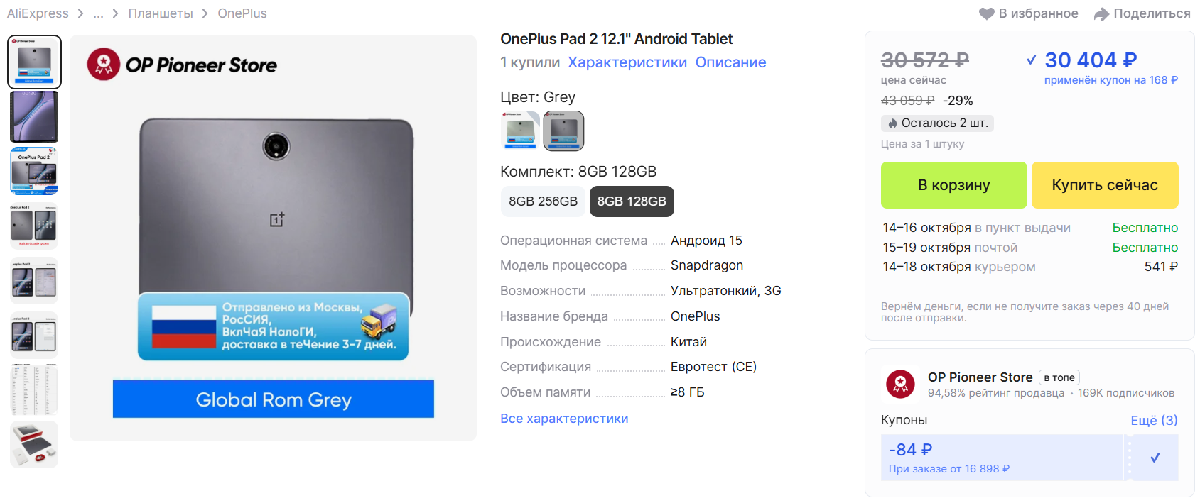 🔥OnePlus Pad 2 за 30 404 рубля с учетом купона продавца на Али
