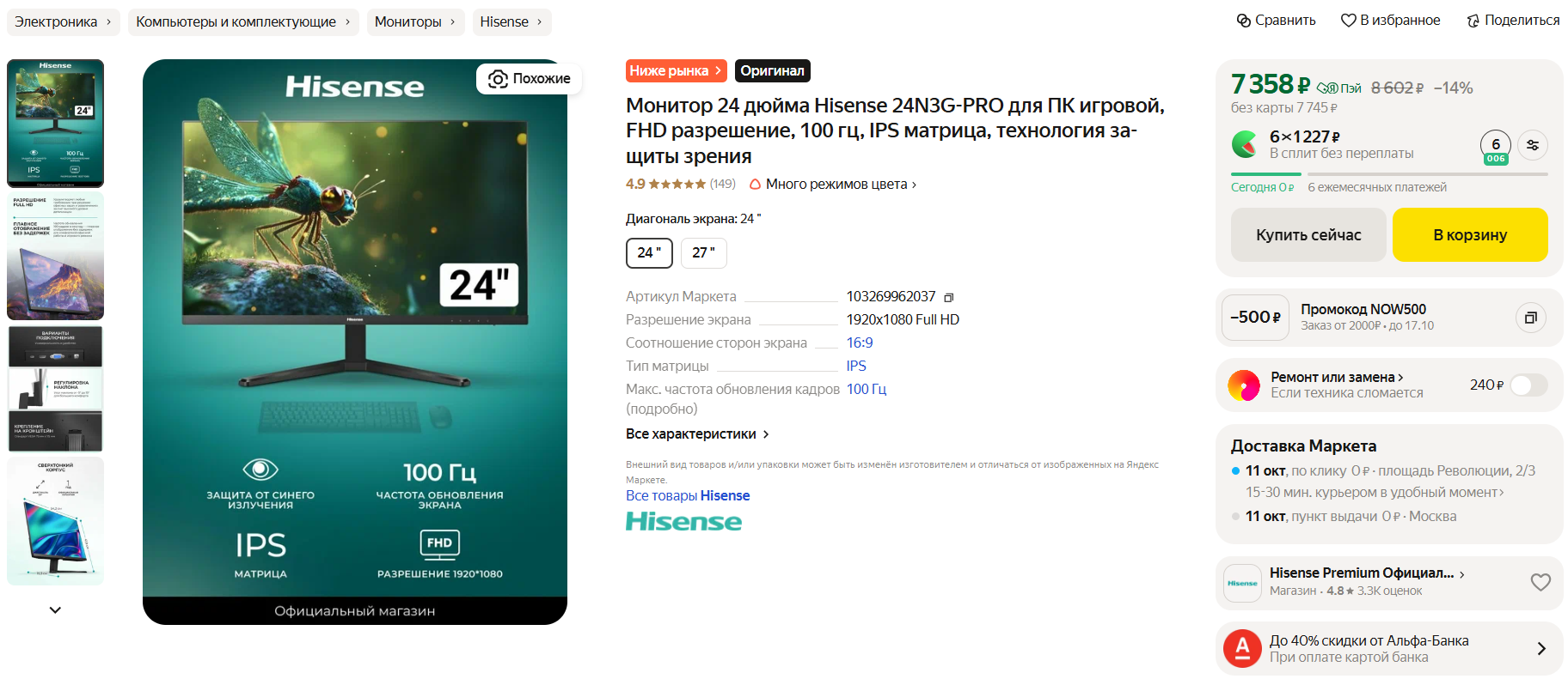 🖥Hisense 24N3G-PRO за 7 358 рублей при оплате картой «Пэй» на Маркете