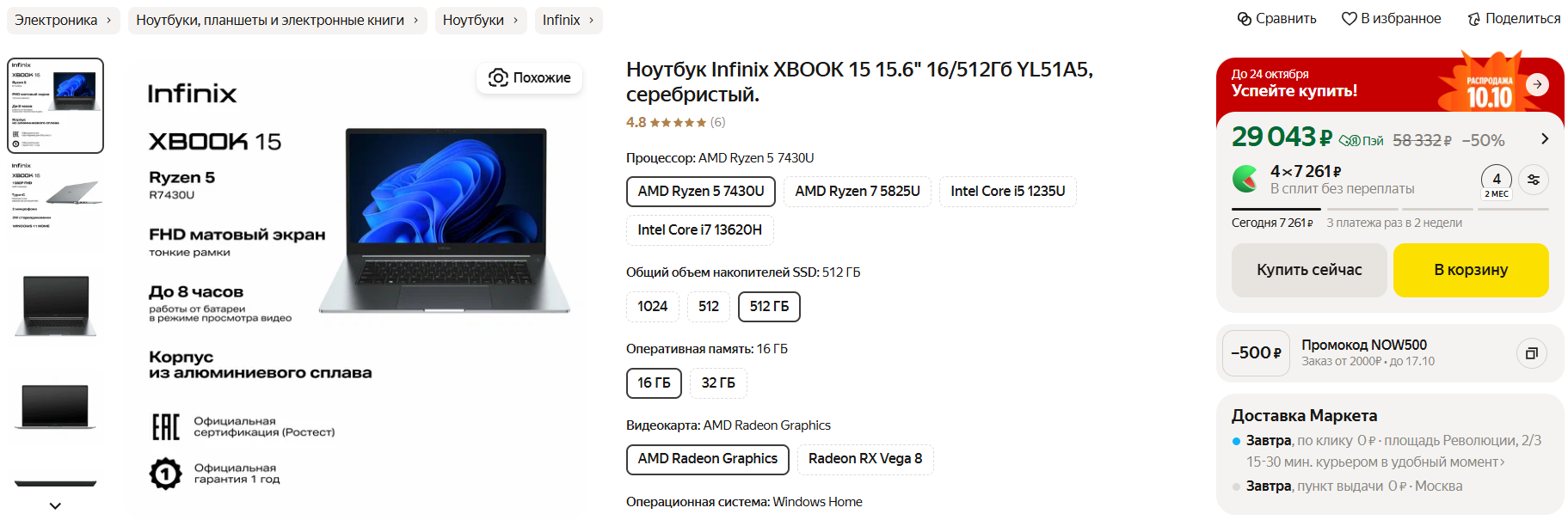 💻Infinix XBOOK 15 за 29 043 рубля при оплате картой «Пэй» на Маркете