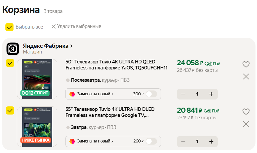 • Tuvio TQ50UFGHH11 за 24 058 рублей. Дисплей тут чуть меньше (50 дюймов), зато с QLED-подсветкой, то есть картинка сочнее, ярче и контрастнее, так еще и черный цвет ближе к натуральному. Устройство работает на фирменной YaOS и поддерживает голосовое управление через пульт. Купить
