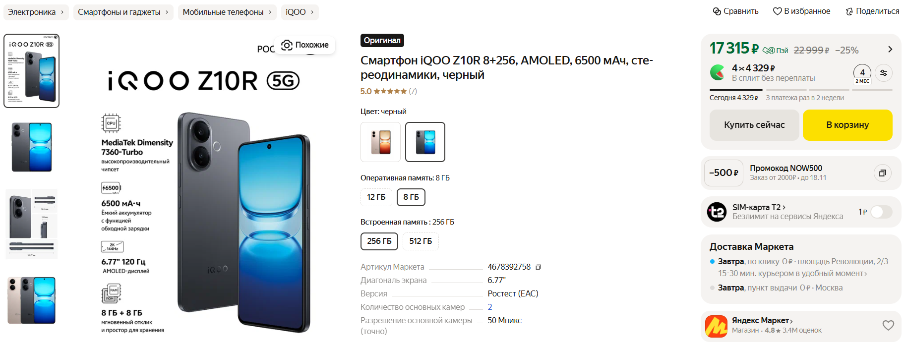 🔥iQOO Z10R за 17 315 рублей при оплате картой «Пэй» на Маркете