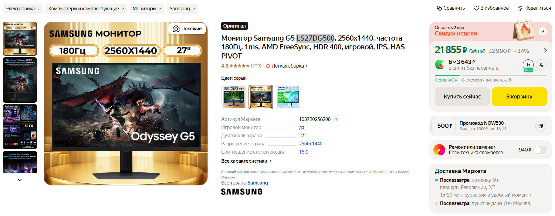 🖥Samsung Odyssey G5 (LS27DG500) за 21 855 рублей при оплате картой «Пэй» на Маркете