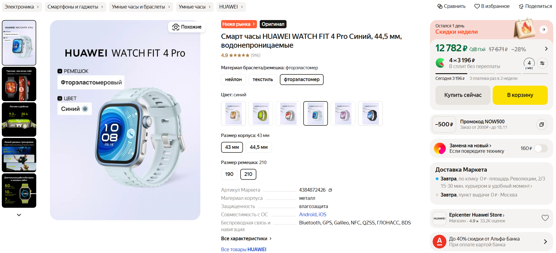 ⌚️Huawei Watch Fit 4 Pro за 12 782 рубля при оплате картой «Пэй» на Маркете