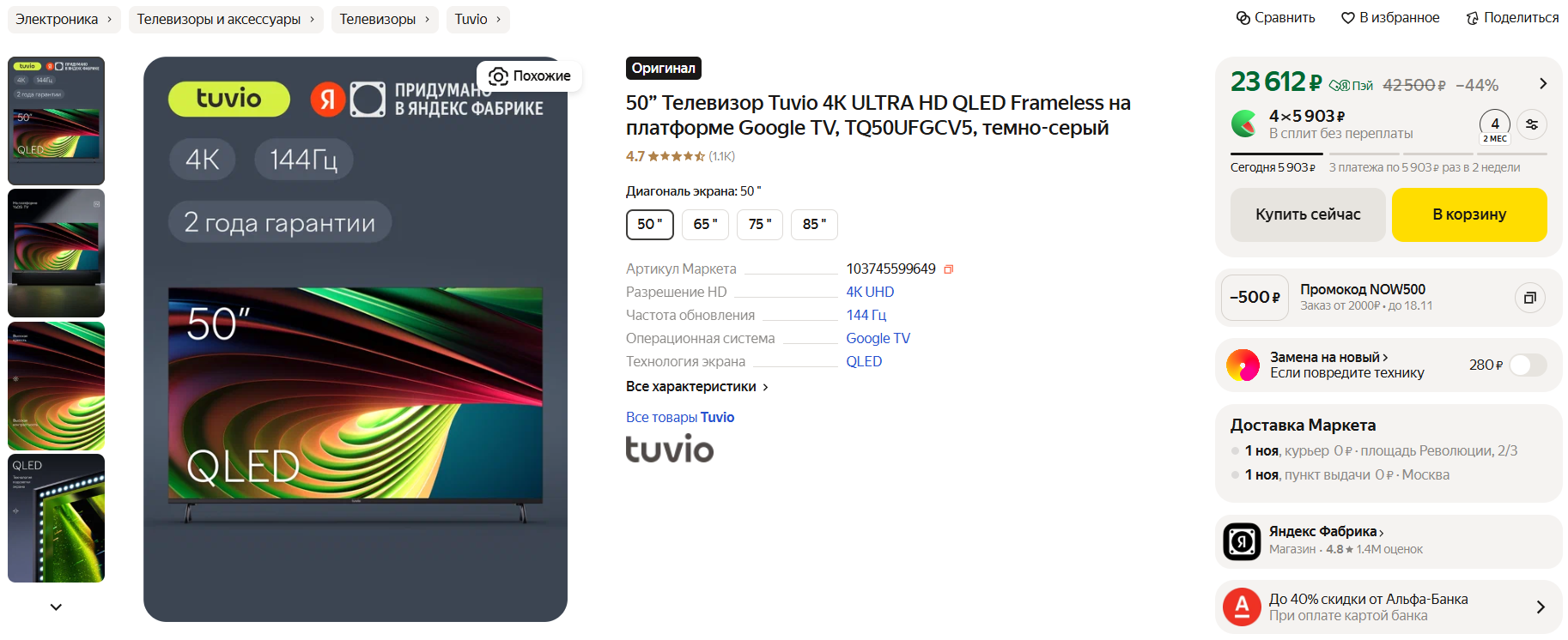 📺Tuvio TQ50UFGCV5 за 23 612 рублей при оплате картой «Пэй» на Маркете