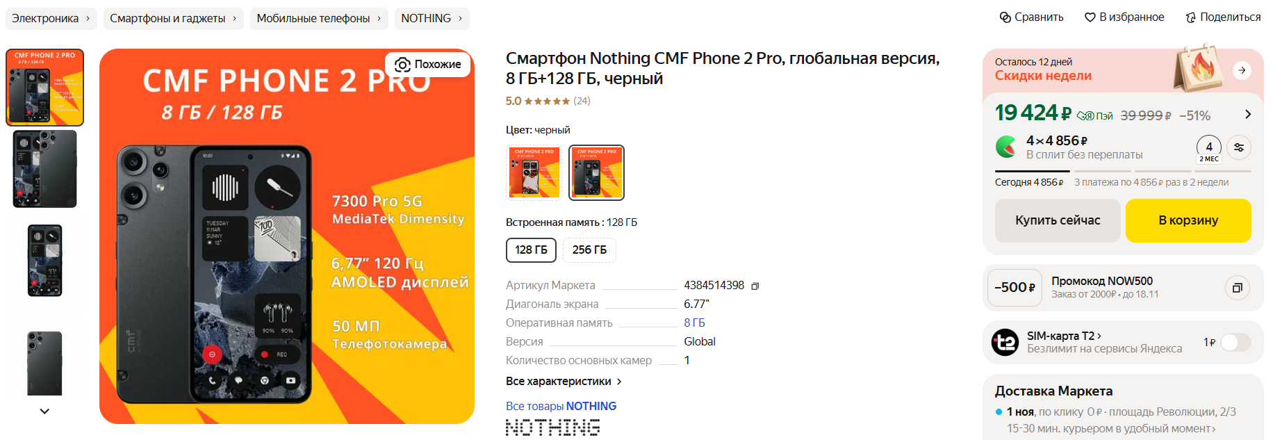 💥CMF Phone 2 Pro за 19 424 рубля при оплате картой «Пэй» на Маркете