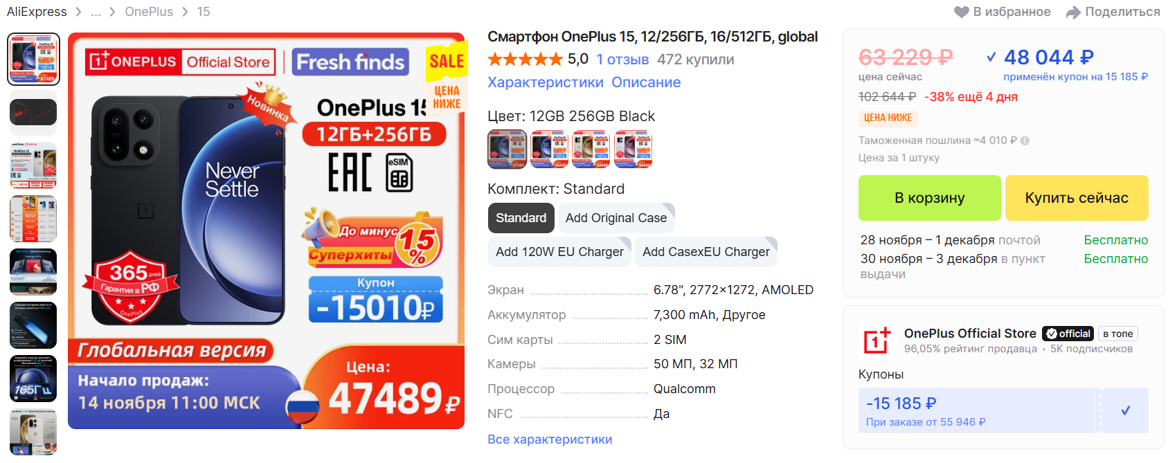 📱Новинка! OnePlus 15 за 48 044 рубля с учетом купона продавца на распродаже 11.11 на Али