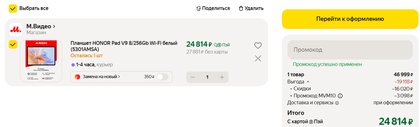 🔥Honor Pad V9 за 24 814 рублей с учетом промокода и оплаты картой «Пэй» на Маркете
